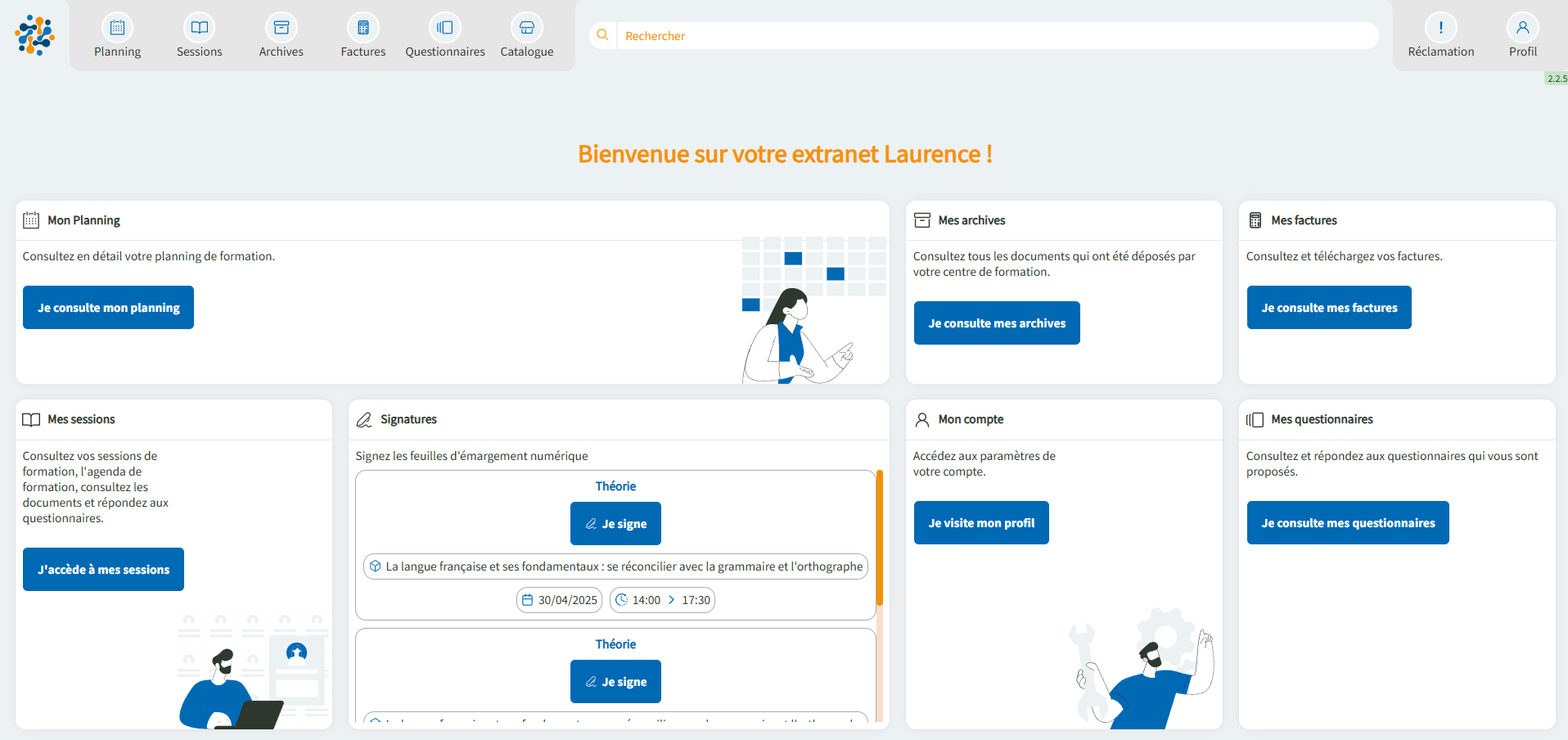 ➝ Portail extranet clients et apprenants inclus, avec diffusion automatique de l’ensemble des informations relatives aux formations, et inscription en ligne