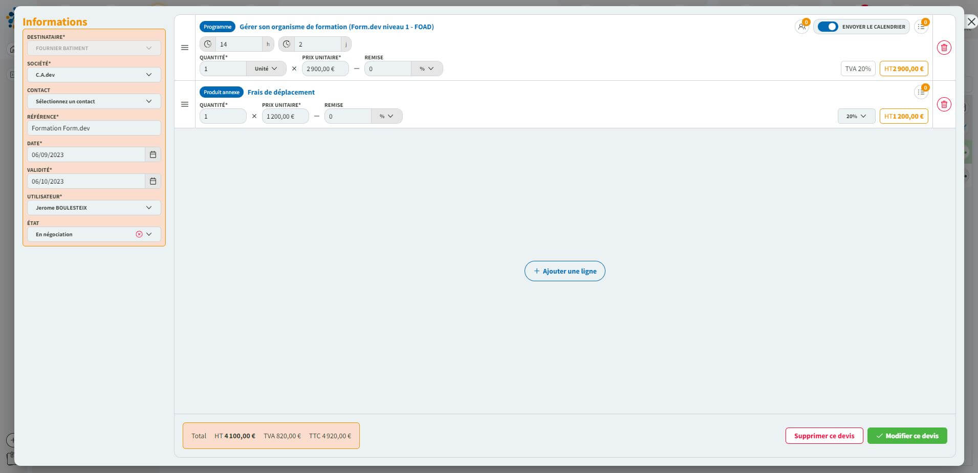 - Créez et envoyez vos devis : devis sur catalogue, sur une action de formation.
